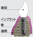 インプラント治療とは、人工歯根治療ともいわれ、歯が欠損した部分の顎の骨に、チタン性の人工歯根を埋め込む外科手術です。