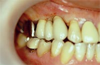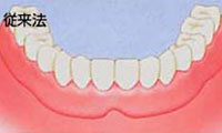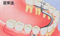健康な歯に金属のバネをかけて入れ歯を固定します。違和感があり、バネをかけた歯にも負担がかかります。